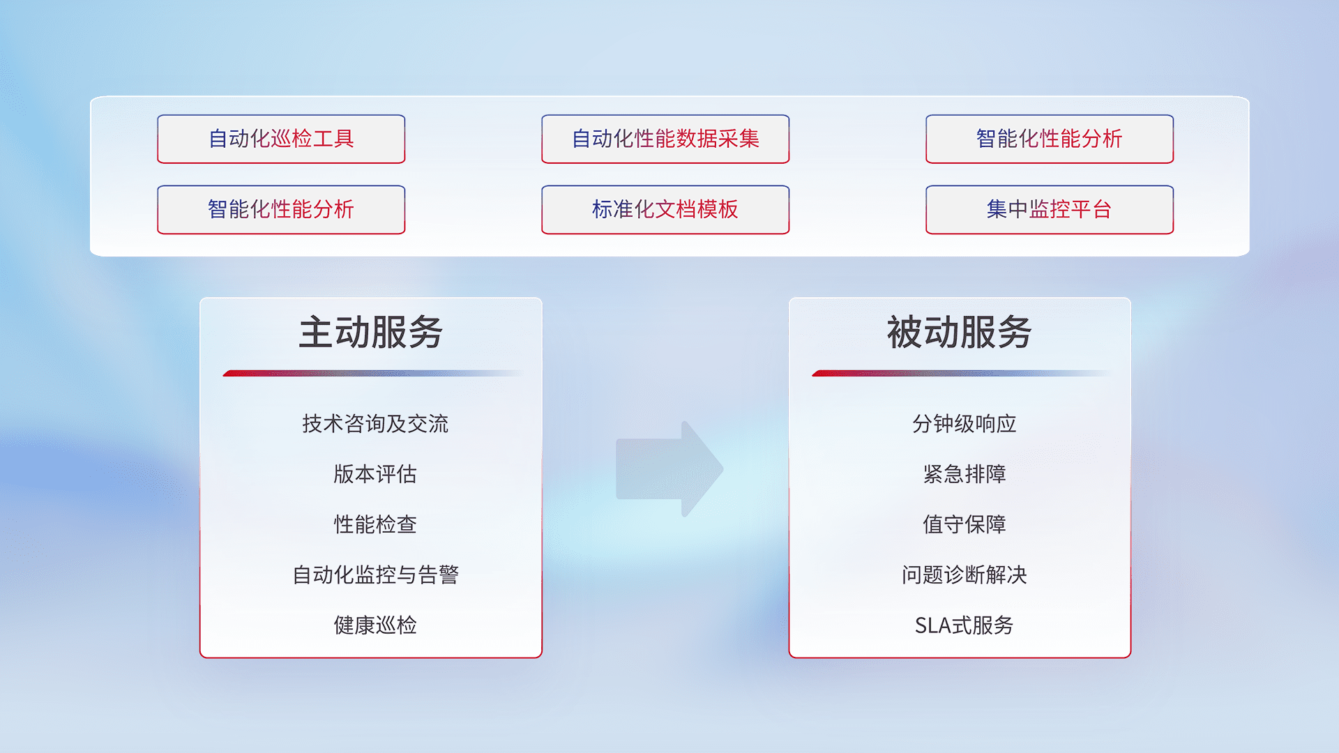 智能化工具和标准化文档,,,,保障服务质量,,,提供主动服务(包含技术咨询、、、、版本评估、、、性能检查、、、、自动化监控与告警、、、健康巡检)和被动服务包含(分钟级响应、、紧急排障、、值守保障、、、、问题诊断解决、、、SLA服务)。。。